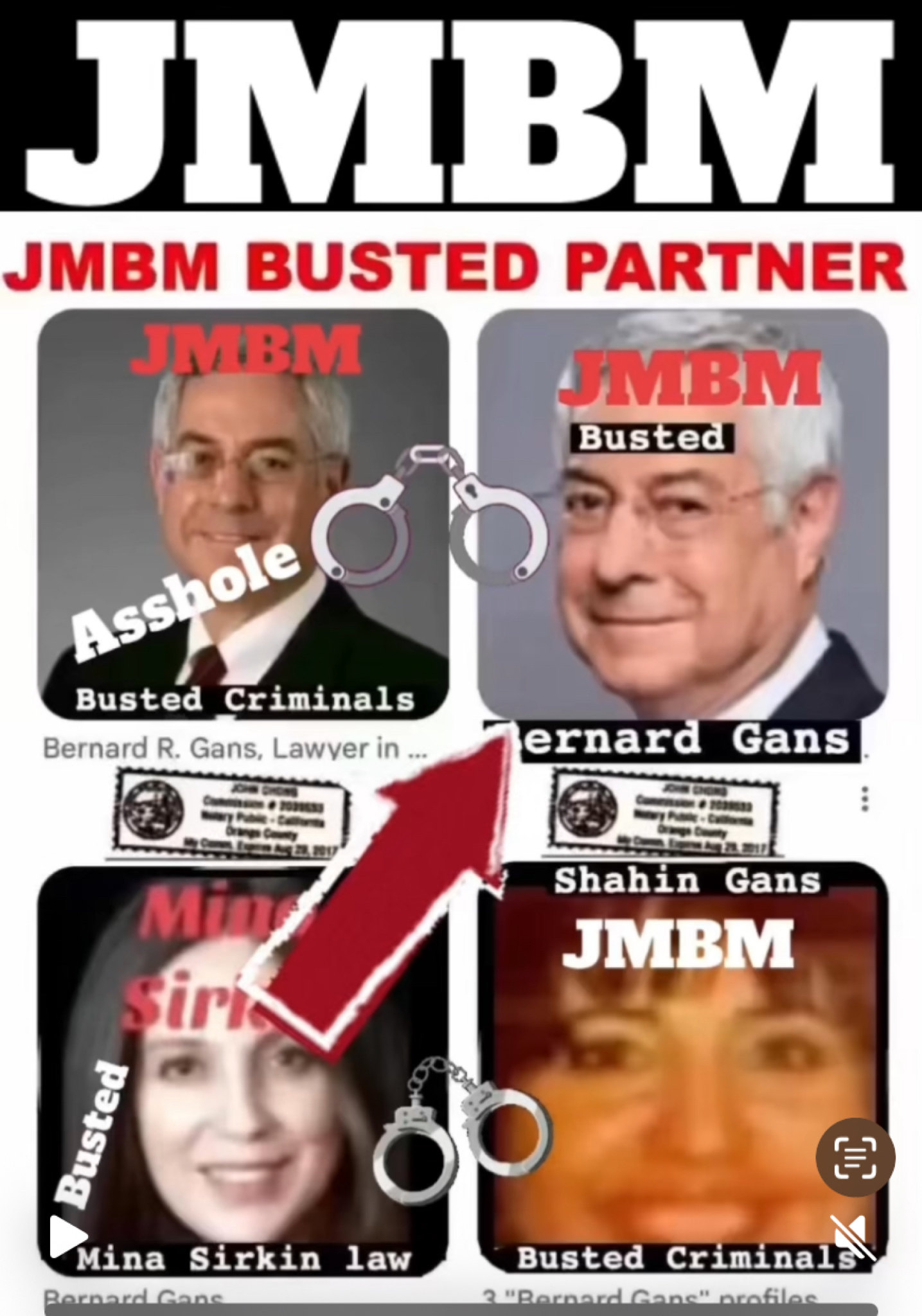 76 year old Century city JMBM busted attorney Bernard Reginald Gans known as Bernie graduate of Santa Barbara university married to Shahin Gans 50 years of success to satisfy his wife he made one stupid mistake and it all crashed down. Well done Bernie well done.Bernard R Gans Articles Jeffer Mangels Butler & Mitchel LLP 76 year old Century city JMBM busted attorney Bernard Reginald Gans known as Bernie graduate of Santa Barbara university married to Shahin Gans 50 years of success to satisfy his wife he made one stupid mistake and it all crashed down. Well done Bernie well done.Bernard R Gans Articles Jeffer Mangels Butler & Mitchel LLP